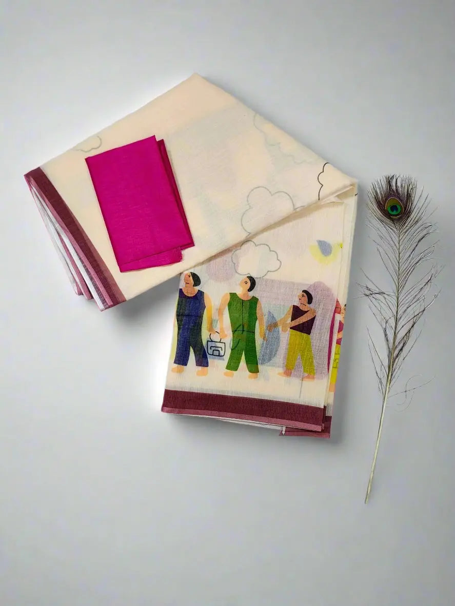 Cream Linen Cotton Saree with Quirky Cartoon Village Motifs - Soft