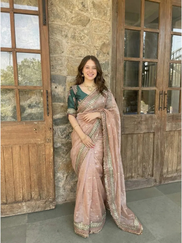 This Banarasi silk saree is made from soft modal silk that drapes beautifully and ensures all-day comfort. Ideal for bridesmaids and traditional gatherings alike, this Banarasi saree for wedding exudes grace, luxury, and timeless craftsmanship, a must-have for every woman who loves classic Indian elegance.