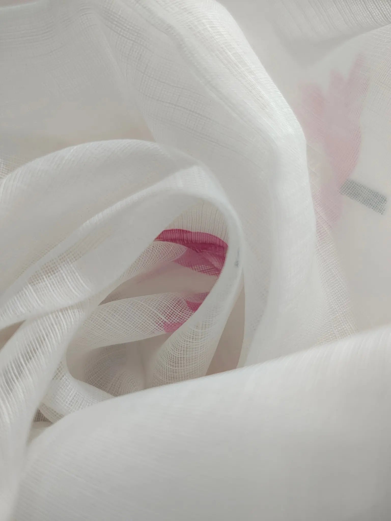 Linen Cotton Saree with Lotus Print & Scalloped Border – White & Pink Soft Linen Saree